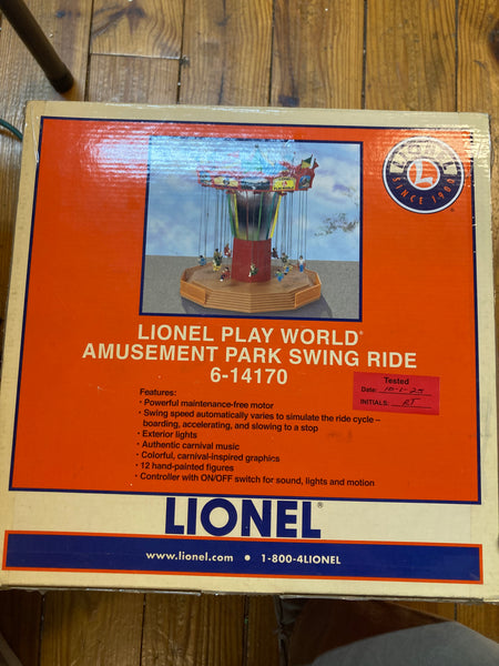 A staple of carnivals and county fairs, the swing ride continues the series of Lionel amusement park favorites. The ride slowly builds in speed, thrilling its riders as the seats swing further out. Exterior lights and cheerful carnival music highlight the action. . FEATURES:, Powerful maintenance-free motor, Cycle-controlled variable speed, Exterior lights, Authentic carnival music, Colorful, carnival-inspired graphics, Hand-painted figures, ON/OFF controls for sound, lights and motion
