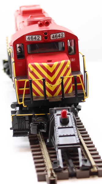 Metal Wheels, Axles and Gears Die-Cast Truck Sides, Pilots and Fuel Tank Colorful Paint Scheme Metal Chassis Metal Handrails and Decorative Horn Intricately Detailed ABS Body Locomotive Speed Control (2) Precision Flywheel Equipped Motors (2) Remotely Controlled Proto-CouplersT (1) Engineer Cab Figure Operating Smoke Unit Directionally Controlled Headlights Proto-Sound 3.0 With The Digital Command System Featuring: Freight Yard Proto-Effects Unit Measures:14 7/8" x 2 3/4" x 4" Operates On O-31 Curves Diesel DCC Features Headlight Bell Whistle/Horn Start Up/Shut Down Rear Coupler Front Coupler Engine Sounds On/Off Sound Volume Ditch Lights Auto/On/Off Forward Signal Reverse Signal Grade Crossing Signal Cab Light On/Off Extended Start Up Extended Shut Down Rev Up Rev Down Coupler Slack Sound Coupler Close One-Shot Doppler Feature Reset Idle Sequence 1 Idle Sequence 2 Idle Sequence 3 Brakes Auto/Off Cab Chatter Auto/Off Clickety-Clack Auto/Off