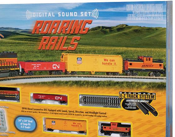 The Roaring Rails powerful locomotive sounds its horn and rings its bell to warn everyone along the line that nothing can deter this train from finishing its route. Roaring Rails features a DCC sound-equipped GP40 with a diesel sound package that includes a prototypical prime mover, three air horns, and a bellall in polyphonic 16-bit sound that you can control with our E-Z Command digital control system.
