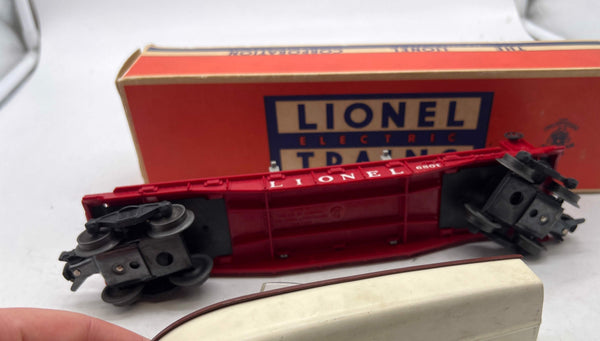 The Boat Flat Car No. 6801 was produced on a RED flat car chassis between 1957 and 1960. Early issues came with bar-end trucks that have tabbed couplers and the number to the right of the serif "LIONEL" lettering on the sides. Subsequent variations would have the heat-stamped number to the left.