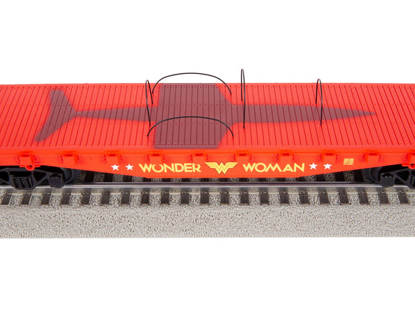 Grow your Justice League collection with this DC Wonder Woman Invisible Jet Flatcar featuring wiring that gives the appearance of holding the invisible jet!JUSTICE LEAGUE and all related characters and elements (C) & TM DC Comics. WB SHIELD (C) & TM WBEI. (s23) All DC characters and elements © & ™ DC Comics. (s23).- Die-cast trucks