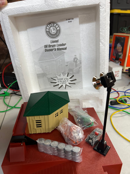 For fast paced, fun action, the Oil Drum Loader is a real winner. You’ll watch in amazement as the forklift driver maneuvers his vehicle back and forth from the train to the loading ramp with oil drums in tow. He will even work after hours for you as a yard light basks the platform in brilliant illumination. A more dedicated worker you won’t find! Compatible with Lionel or American Flyer S-Gauge trains. Gondola sold separately.