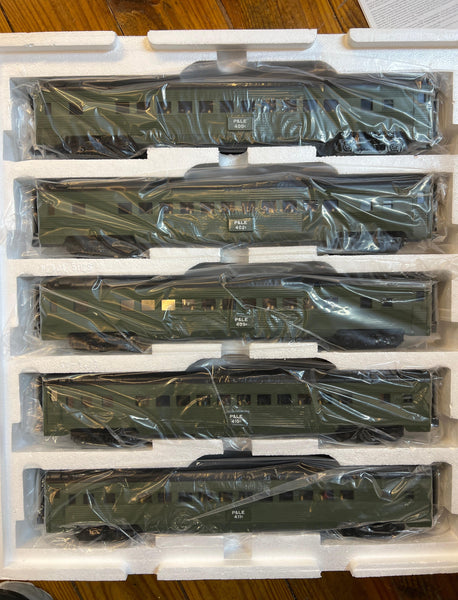 MTH Premier 20-65200 Pittsburgh & Lake Erie PLE Military green 5-Car 70' Streamlined Passenger Set Ribbed Sided O SCALE NEW