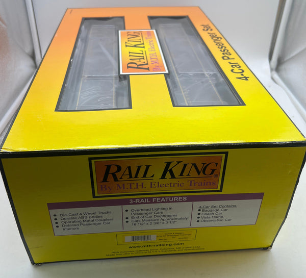- Durable ABS Intricately Detailed Bodies - Metal Wheels and Axles - Overhead Interior Lighting - Die-Cast 4-Wheel Trucks - Operating Die-Cast Metal Couplers - Colorful, Attractive Paint Schemes - End-of-Car Diaphragms - Fast-Angle Wheel Sets - Needle-Point Axles - Detailed Car Interiors - 4-Car Sets Feature: (1) Baggage, (1) Coach, (1) Vista Dome, (1) Observation - Unit Measures:68 3/4" x 2 5/8" x 3 5/16" - Operates On O-31 Curves