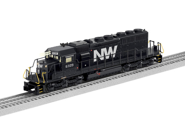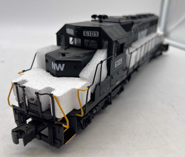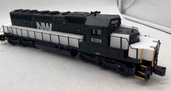 Norfolk & Western LEGACY Scale SD40-2 Diesel #6109. Legacy Control System equipped – able to run in LEGACY Control mode, in TrainMaster Command Control mode, or in Conventional mode with a standard transformer, Odyssey II Speed Control with On/Off switch, LEGACY RailSounds sound system featuring:-CrewTalk dialog and TowerCom announcements, each with different scenarios depending on whether the locomotive is in motion or stopped -Six official railroad speeds with CrewTalk dialog-Eight diesel RPM levels-LEGACY "Real-Time Quilling Horn" control with instant response for realistic signature "quilling" and correctly timed warning signals-Single hit or continuous mechanical bell sounds- Sequence Control plays the sound effects of an entire trip, including warning sounds and announcements, based on the movement and speed of the locomotive- Current speed and fuel dialog, refueling sound effects, IR Sensor equipped, Front and rear ElectroCouplers, Dual powerful maintenance-free motors with momentum flywheels, Refined Conventional Transformer Control Mode with lower starting speeds, Traction tires, Fan-driven smoke unit, Adjustable smoke output, Directional lighting including LED headlights, Operating marker lights on front and rear, Illuminated number boards, Lighted cab interior, Operating ditch lights, Die-cast metal trucks, pilots, and fuel tank, Metal frame, High level of separately applied metal details, Engineer and conductor figures