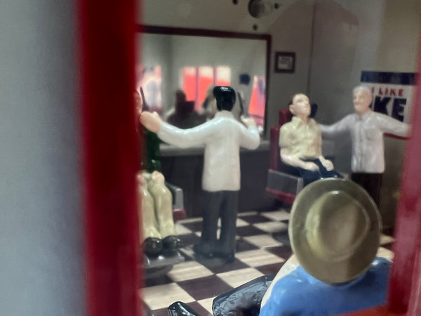 From the checkerboard tiled floor to the ceiling fans and pressed tin ceiling, Harry put a lot of time and effort into making his shop the best in the county. Always busy, Harry and Leo, his young protg working the second chair, know all of the popular styles from the flat top to the Ivy League. Theyve already got customers waiting patiently, including an anxious little whippersnapper, while they finish up a couple of the local gentry. They work fast, too. Watch them as they move back and forth putting the finishing snips on a great haircut. Outside, the glow of the spinning barber pole puts a smile on the face of every passerby in downtown Lionelville.. FEATURES:, Detailed interior with animated barbers, overhead lighting, sinks and wall mirror, Lighted, operating barber pole, Premium decoration on inside and outside , Convenient size makes it simple to fit on any layout, Sidewalk base is removable for layouts with existing roads and sidewalks, Seven detailed figures (two animated barbers, two customers in chair, three customers waiting), Removable roof with skylight, ceiling fans and pressed tin styled ceiling , Gutter, downspout and door details on back side of building