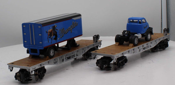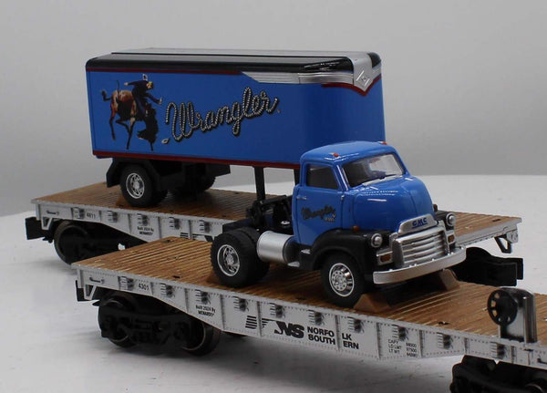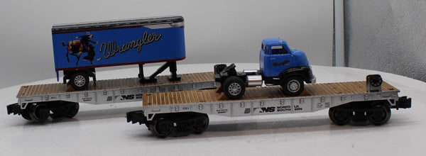 Product Title: Menards 275-9392 NORFOLK SOUTHERN 2-Piece Flatcar with 1954 GMC Wrangler Tractor & Trailer Set O Scale