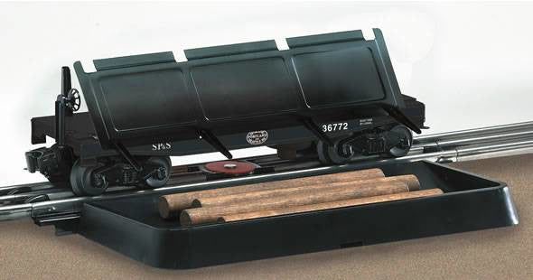 None. FEATURES:, Die-cast metal trucks and operating couplers, Dump logs at the touch of a button (Remote control track section required), Includes natural log load and unloading bin, Die-cast metal body