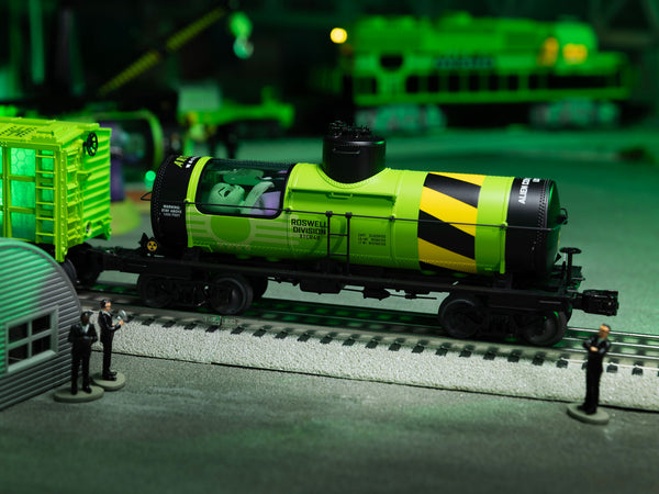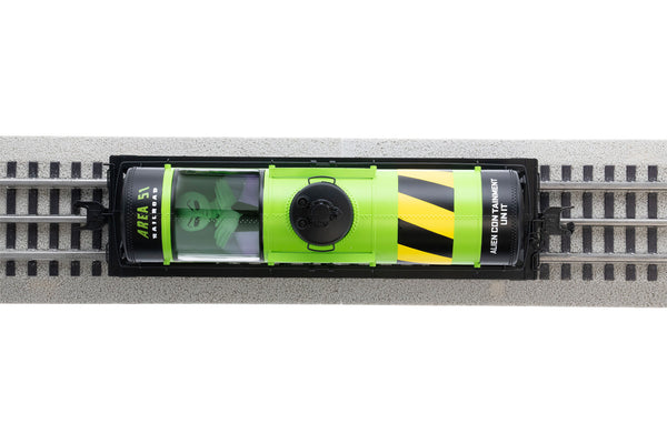 Our Area 51 rolling stock and accessories provide out of this world fun for scale or traditional layouts! These fun new scale rolling stock pieces include a hotbox "cryogenic transport unit", a glowing heavy duty flatcar carrying who-knows-what and another transport unit that the government has left surprisingly open for viewing! The tank car window reveals a large alien in protective fluid within. His partner isnt faring as well in our Area 51 Tank car accident accessory, complete with additional figures and a glowing spill. You can even add more life to your layout with additional new figures available separately..- Die-cast trucks
