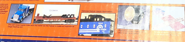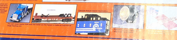 • Includes Conrail boxcar, Jefferson Lake Sulfur Company three dome tank car, Conrail flatcar with trailer, operating Conrail searchlight car, Conrail square window caboose with interior illumination