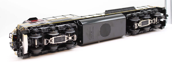 . Legacy Control System equipped–able to run in LEGACY Control mode, in TrainMaster Command Control mode, or in Conventional mode with a standard transformer, Odyssey II Speed Control with ON-OFF switch, LEGACY RailSounds sound system featuring:-CrewTalk dialog and TowerCom announcements, each with different scenarios depending on whether the locomotive is in motion or stopped-Five official railroad speeds with CrewTalk dialog-Eight diesel RPM levels-LEGACY "Real-Time Quilling Horn" control with instant response for realistic signature "quilling" and correctly timed warning signals-Single hit or continuous mechanical bell sounds, Front and rear ElectroCouplers, Dual powerful maintenance-free motors with momentum flywheels, Refined Conventional Transformer Control Mode with lower starting speeds, Traction tires, Fan-driven smoke unit, Adjustable smoke output, Directional lighting including LED headlights, Operating marker lights, Illuminated number boards, Illuminated cab interior, Oscillating ditch lights, Ground lights, Die-cast metal trucks, pilot, and fuel tank, Metal frame, Separately applied metal details, Engineer and fireman figures