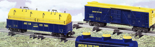 None. CARS IN 3-PACK INCLUDE:, American Flyer Tank Car, American Flyer Stock Car, American Flyer Gondola with Coil Covers, FEATURES:, Die-cast metal trucks and operating couplers, Metal handrails and ladders on tank car, Removable coil covers on gondola, Opening doors on stock car, Metal frame on stock car
