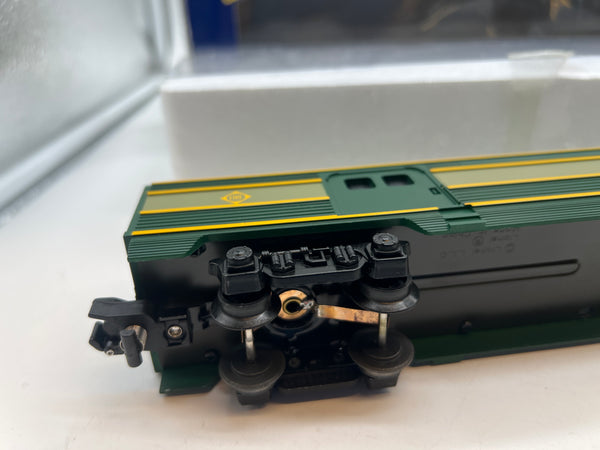 None. Die-cast metal trucks and operating couplers, Stamped metal frame, Interior illumination.- Die-cast metal trucks and operating couplers