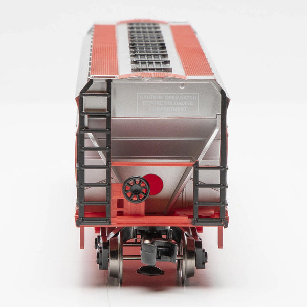 The cars have the familiar boxy shape of a hopper, but with smooth, gently curving sides. Up top is a finely detailed walkway running around four sides of the roof, with loading hatches running along the centerline. On the frame are four discharge hatches.