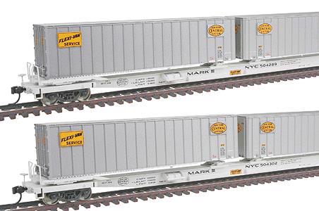 * All-New Tooling * Includes Two Road-Specific Trailers * Use on Freight or Passenger Trains * Ready to Run * Metal RP-25 Wheels * Knuckle Couplers * Razor-Sharp Paint and Lettering * Modeler-Installed Grab Irons IncludedAs trailer-on-flat-car (TOFC) service evolved in the late 50s, many roads began trying to cut costs, opening the door to new ideas. Among these was the Flexi Van system, first tested by the New York Central in 1957. Designed to speed loading and unloading, the design used a special turntable (mounted on a standard flat car for testing), and a 36 trailer with a removable wheel assembly (bogie). In operation, the trailer was first aligned with the turntable and backed into place. The bogie was then unlocked and the trailer slid aboard. Once in position, a pin locked the trailer to the turntable, which was turned to the loaded position using the on-board hydraulics. The successful test car paved the way for the first production models in 1958. These were low profile skeleton cars, designed to meet clearance restriction on the NYC and carry two trailer units. Simple pivoting turntables replaced the complex and expensive hydraulic units. Early cars handled only 36 units, but as 40 was quickly becoming the standard length for highway trailers, later models carried a 36 and a 40 unit; cars built from 1961 to 1968 carried two 40 units. On later cars designed to handle 40 bodies, the turntables were moved to the ends and required the services of a specialized terminal tractor. These short wheelbase rigs had a retractable front wheel to simplify lining the truck and trailer with the turntable, and a large push pole provided the extra reach needed to spin the trailer into place. Lighter and lower than standard TOFC cars, the unique design proved well suited for high-speed operation and many cars were rebuilt so they could be moved in both freight and passenger service. Other roads showed some interest in the system, including ATSF, CB&Q, IC, MILW, WP and more. Although intended for most types of freight, the system eventually proved quite popular for handling mail. Although successful, the system had its limits. Snow and ice caused turntable problems during winter months, and the special bogies had to be available at any point where units were off-loaded. The rapid rise of containers and the acceptance of industry-wide methods for moving trailers on flat cars soon pushed Flexi Van service into the pages of history.