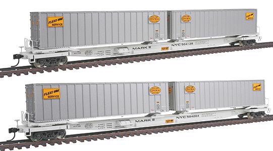 * All-New Tooling * Includes Two Road-Specific Trailers * Use on Freight or Passenger Trains * Ready to Run * Metal RP-25 Wheels * Knuckle Couplers * Razor-Sharp Paint and Lettering * Modeler-Installed Grab Irons IncludedAs trailer-on-flat-car (TOFC) service evolved in the late 50s, many roads began trying to cut costs, opening the door to new ideas. Among these was the Flexi Van system, first tested by the New York Central in 1957. Designed to speed loading and unloading, the design used a special turntable (mounted on a standard flat car for testing), and a 36 trailer with a removable wheel assembly (bogie). In operation, the trailer was first aligned with the turntable and backed into place. The bogie was then unlocked and the trailer slid aboard. Once in position, a pin locked the trailer to the turntable, which was turned to the loaded position using the on-board hydraulics. The successful test car paved the way for the first production models in 1958. These were low profile skeleton cars, designed to meet clearance restriction on the NYC and carry two trailer units. Simple pivoting turntables replaced the complex and expensive hydraulic units. Early cars handled only 36 units, but as 40 was quickly becoming the standard length for highway trailers, later models carried a 36 and a 40 unit; cars built from 1961 to 1968 carried two 40 units. On later cars designed to handle 40 bodies, the turntables were moved to the ends and required the services of a specialized terminal tractor. These short wheelbase rigs had a retractable front wheel to simplify lining the truck and trailer with the turntable, and a large push pole provided the extra reach needed to spin the trailer into place. Lighter and lower than standard TOFC cars, the unique design proved well suited for high-speed operation and many cars were rebuilt so they could be moved in both freight and passenger service. Other roads showed some interest in the system, including ATSF, CB&Q, IC, MILW, WP and more. Although intended for most types of freight, the system eventually proved quite popular for handling mail. Although successful, the system had its limits. Snow and ice caused turntable problems during winter months, and the special bogies had to be available at any point where units were off-loaded. The rapid rise of containers and the acceptance of industry-wide methods for moving trailers on flat cars soon pushed Flexi Van service into the pages of history.