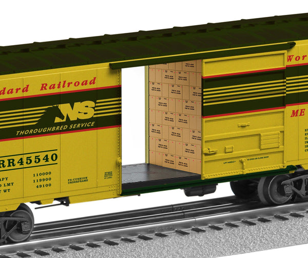 NORFOLK SOUTHERN HERITAGE SERIESThe five important railroads that were ultimately absorbed into modern day Norfolk Southern are being honored. . Die-cast metal sprung trucks and operating couplers, Separately applied metal underframe details, Opening doors, Box loads in interior